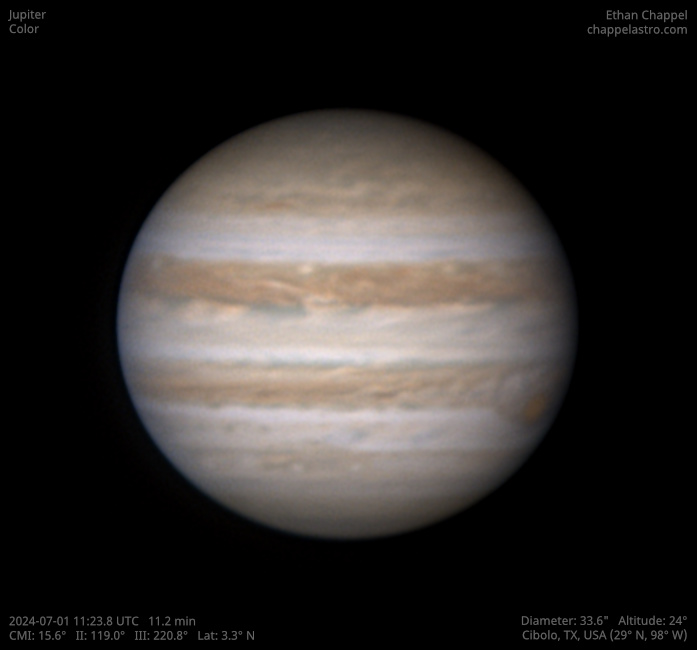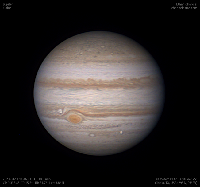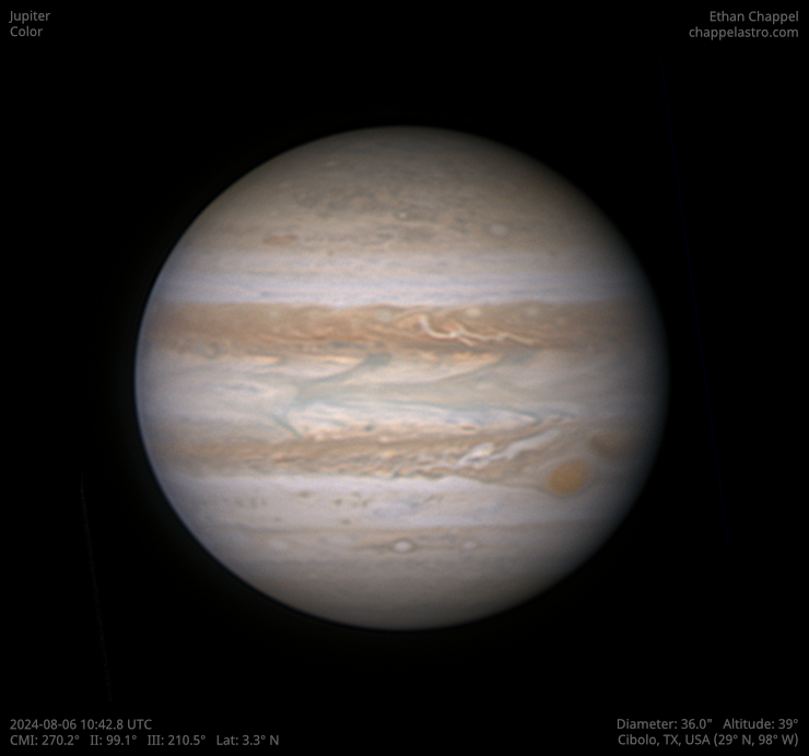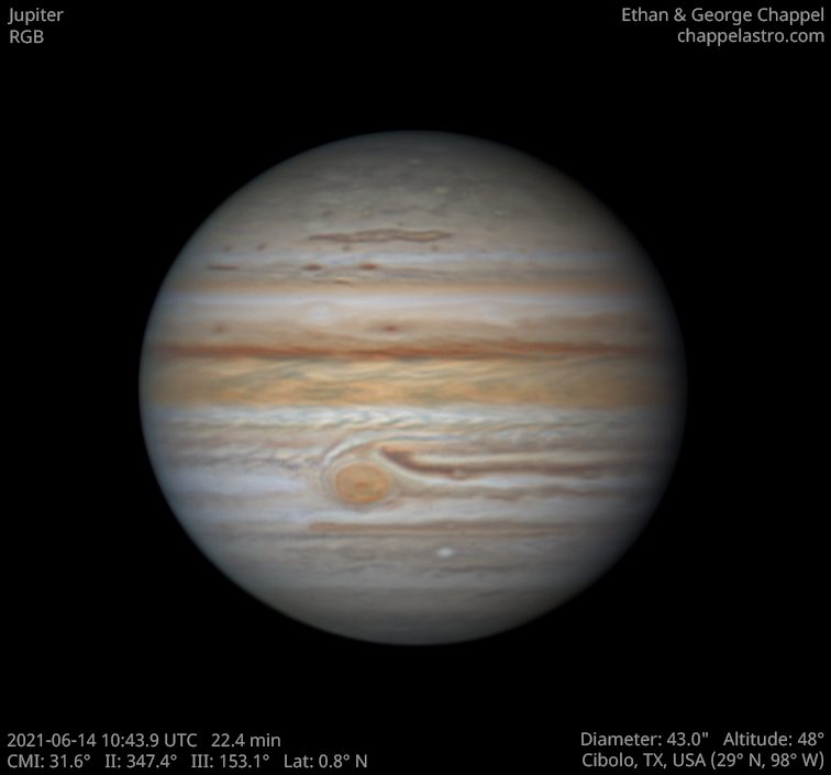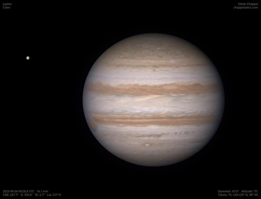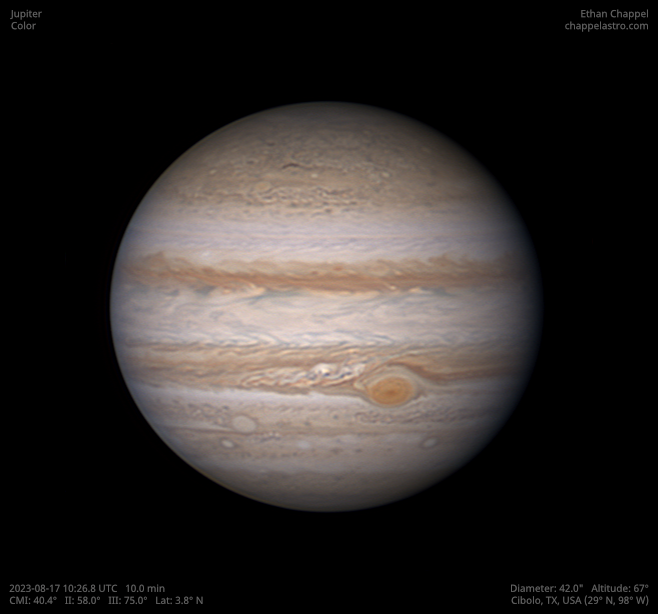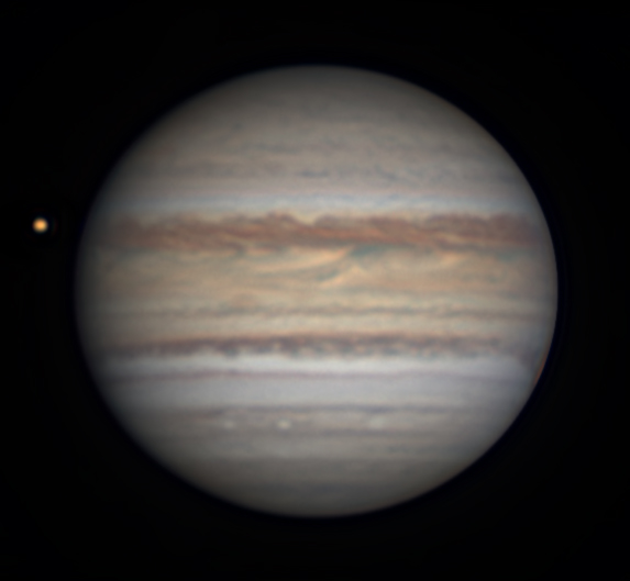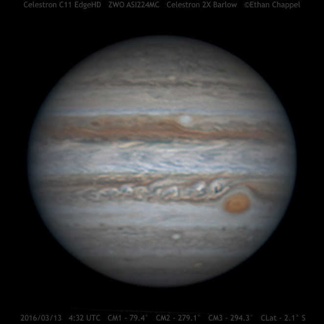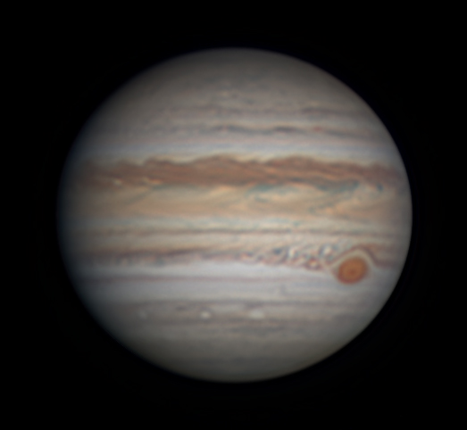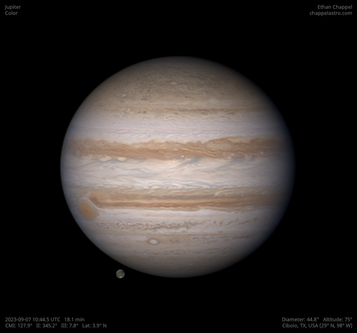 The largest world orbiting the Sun. Its large size, dynamic atmosphere, and moons make it an excellent target for any telescope.